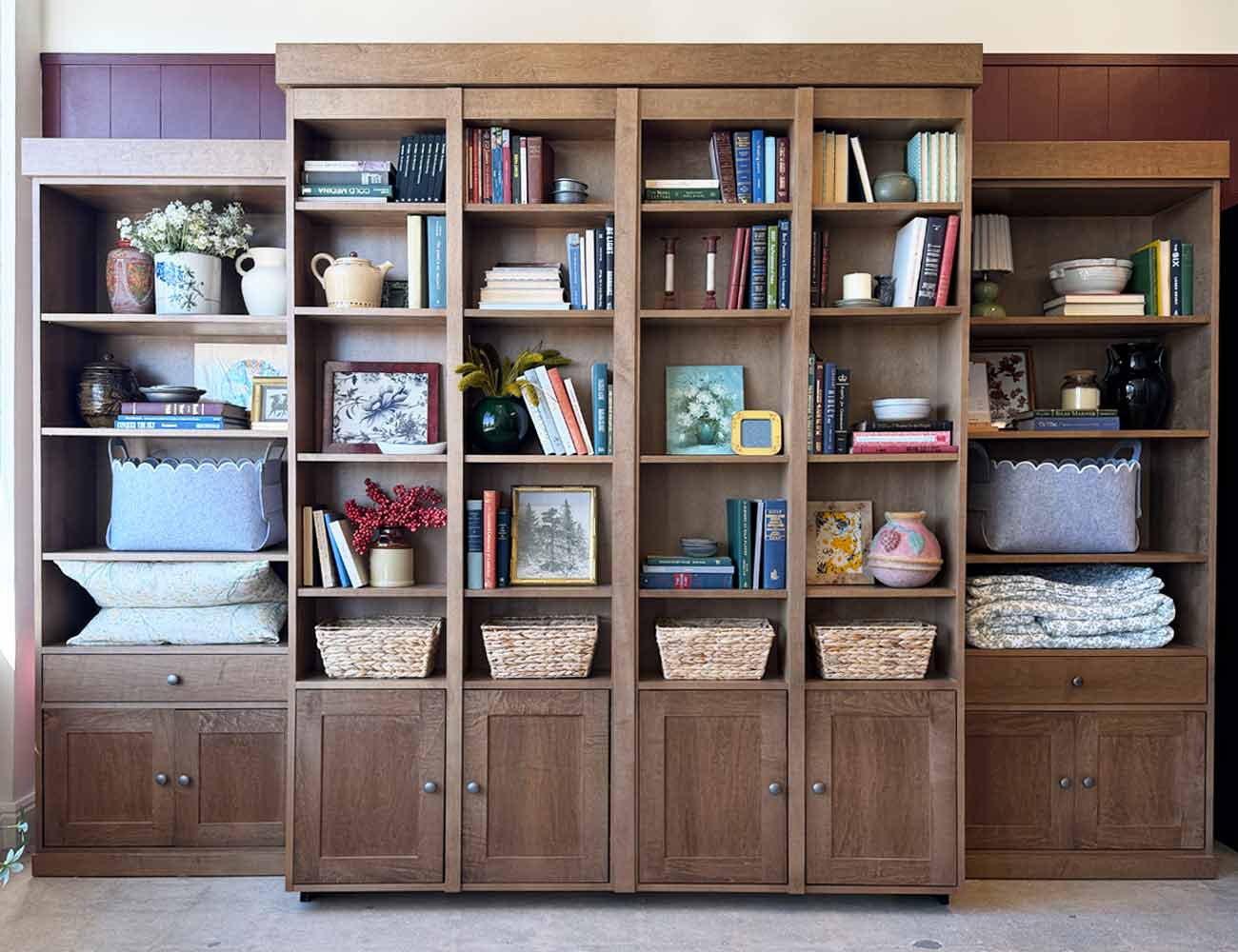 Where else can you get the convenience of a Murphy Bed and the storage of an integral bookcase in one unit? All of our Bookcase Wallbeds, whether Twin, Full or Queen size come with a commercially rated, powder coated, steel Murphy frame complete with European style wood slat mattress support for comfort and wall mount brackets for easy setup. Bi-Fold Bookcase Wallbeds will hold up to 60 lbs. per bookcase section (240 lbs. total) evenly distributed. The bookcase cabinets on the front of the bed are 8 1/4″ deep.